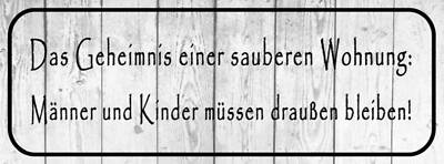 Schild das geheimnis einer sauberen wohnung männer & kinder draussen bleiben