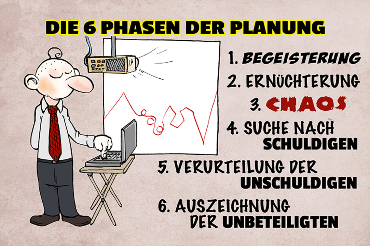 Schild Spruch Die 6 Phasen der Planung Begeisterung Chaos Büro JW