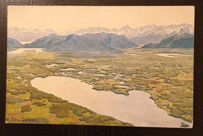 Eine außergewöhnlich reizvolle Künstlerkarte des berühmten Landschaftsmalers Zeno Diemer, der für seine meisterhaften Panoramen und Alpenansichten geschätzt wird. Dieses Werk zeigt den oberen Starnberger See in einer beeindruckenden Vogelperspektive – eine Darstellung, die Weite, Ruhe und die kraftvolle Schönheit des bayerischen Voralpenlandes in selten gesehener Präzision verbindet.