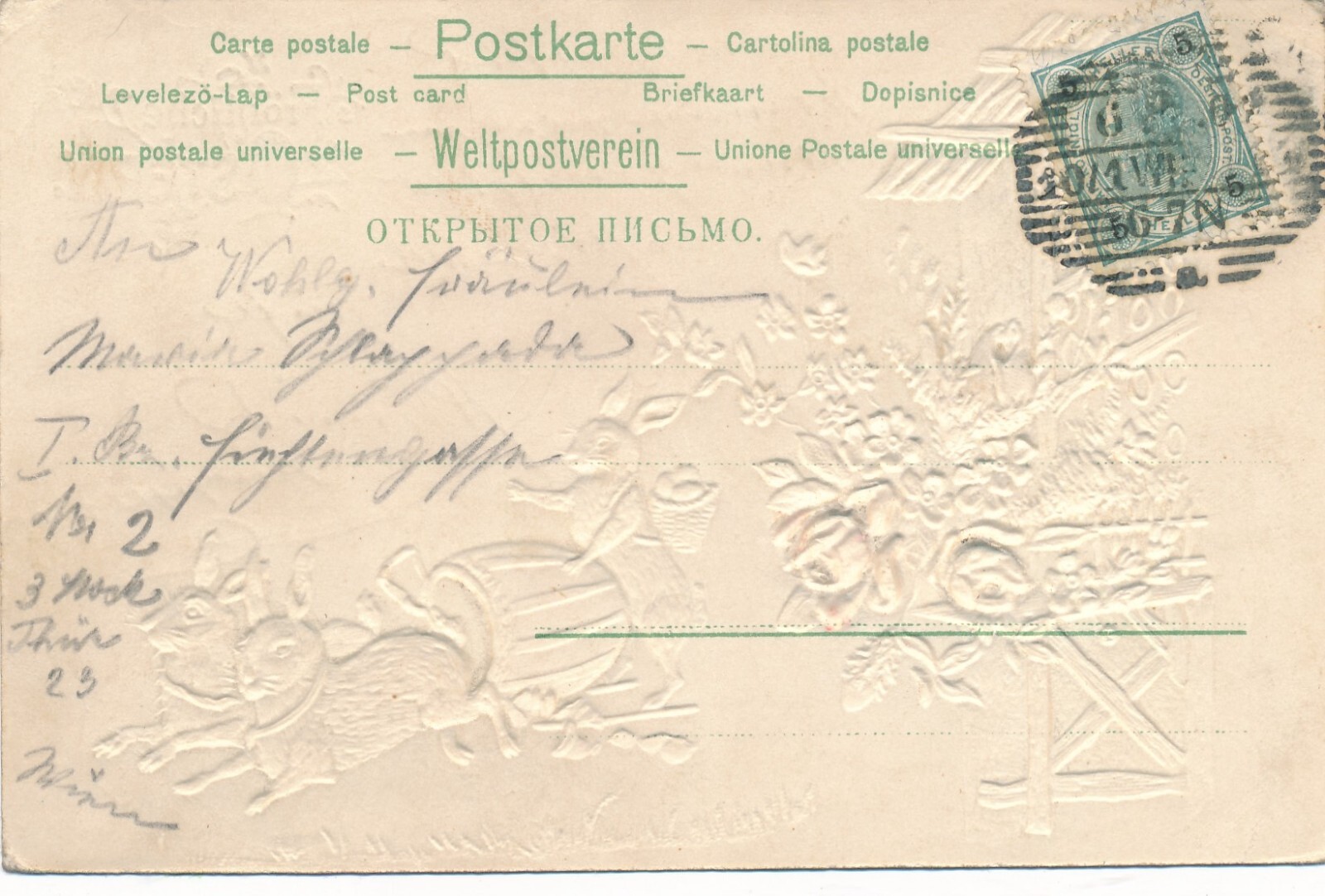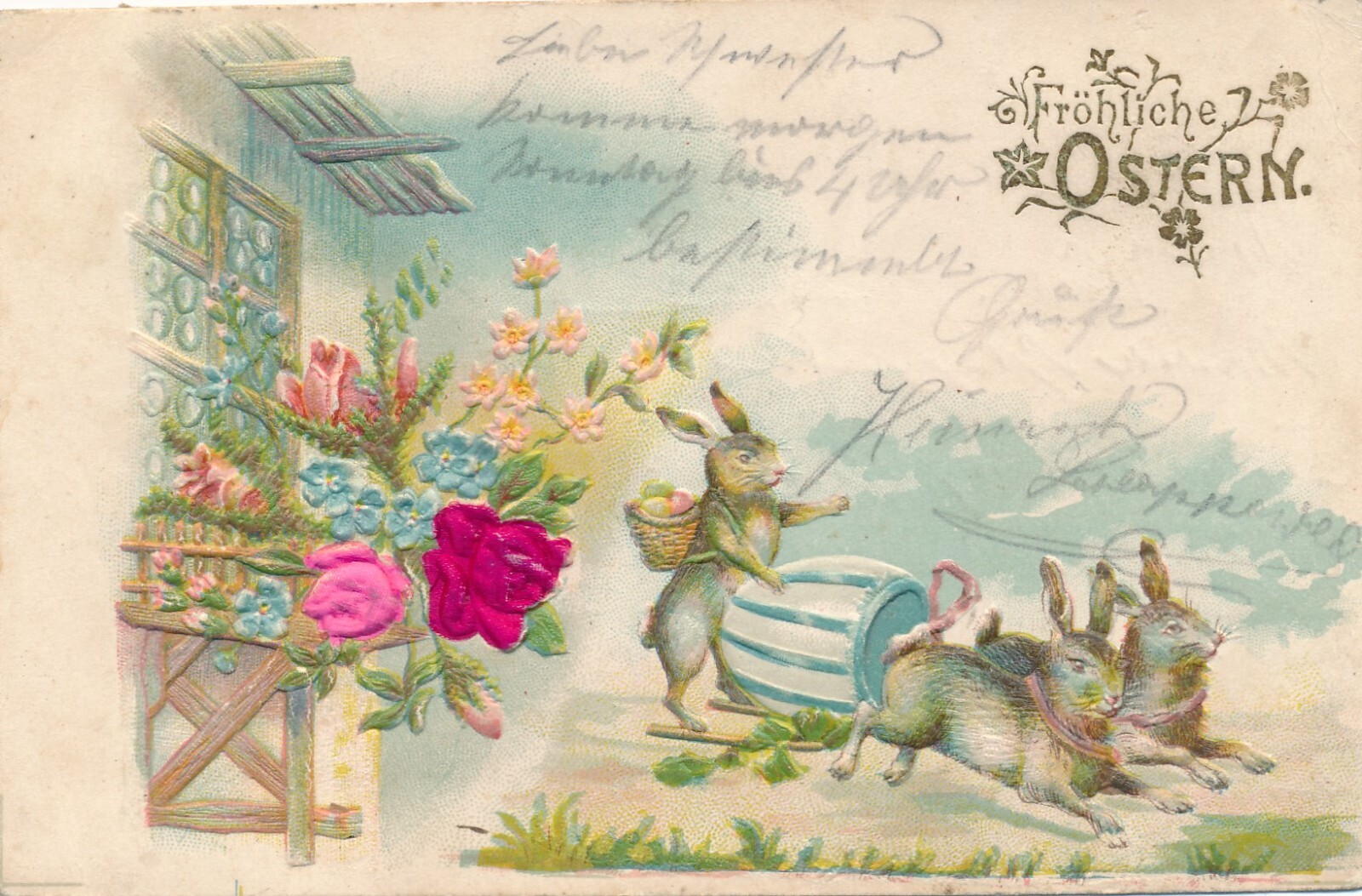 Stoff - Präge - Motiv - Karte Frohe Ostern mit Hasen Ansichtskarte (12657)