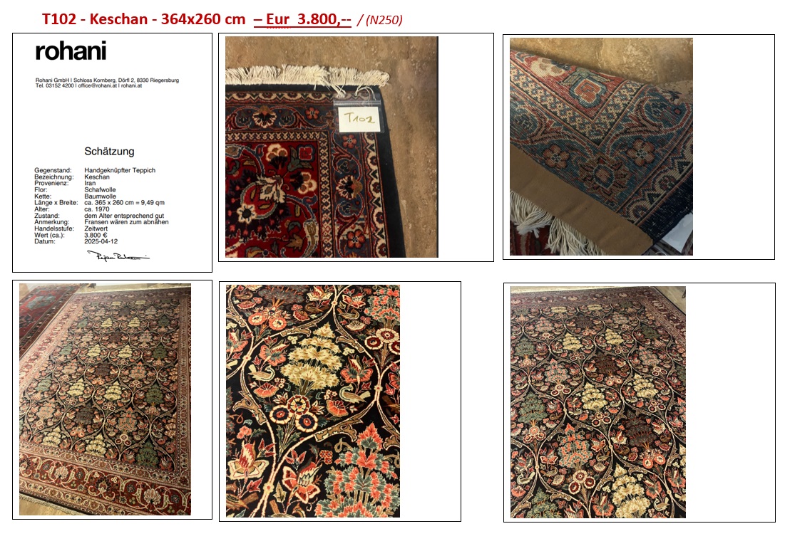 Gegenstand: Handgeknüpfter Teppich Bezeichnung: Keschan Provenienz: Iran Flor: Schafwolle Kette: Baumwolle Länge x Breite: ca. 365 x 260 cm = 9,49 qm Alter: ca. 1970 Zustand: dem Alter entsprechend gut Anmerkung: Fransen wären zum abnähen Handelsstufe: Zeitwert Wert (ca.): 3.800 € Datum: 2025-04-12