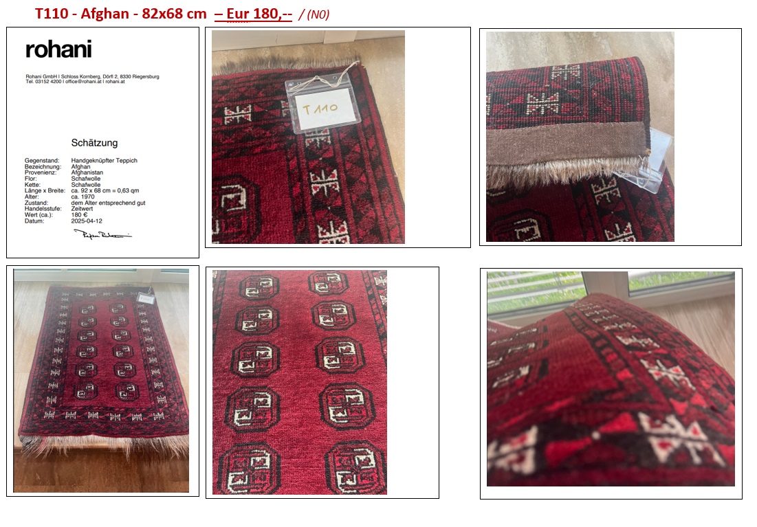 Gegenstand: Handgeknüpfter Teppich Bezeichnung: Afghan Provenienz: Afghanistan Flor: Schafwolle Kette: Schafwolle Länge x Breite: ca. 92 x 68 cm = 0,63 qm Alter: ca. 1970 Zustand: dem Alter entsprechend gut Handelsstufe: Zeitwert Wert (ca.): 180 € Datum: 2025-04-12