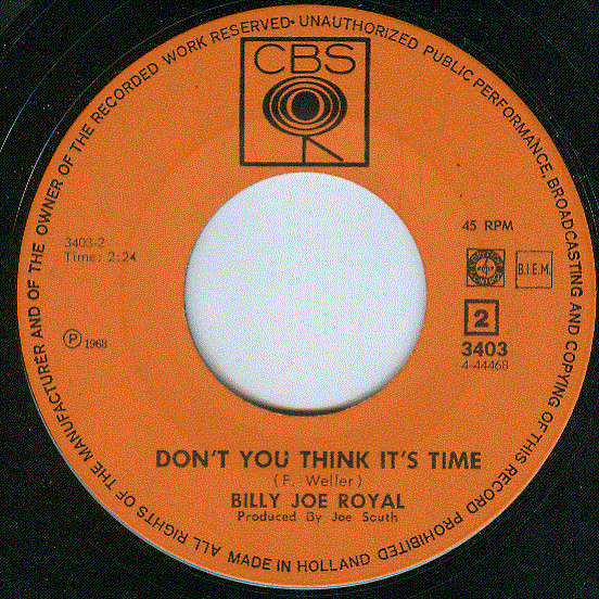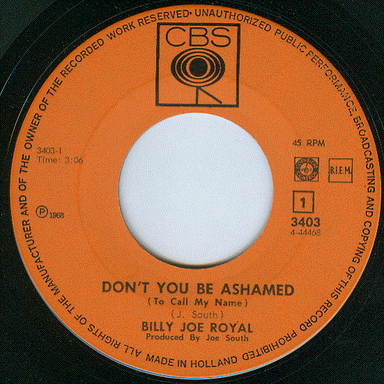 Vinyl / Billy Joe Royal - Don't You Be Ashamed (To Call My Name) /Don't You Think It's Time
