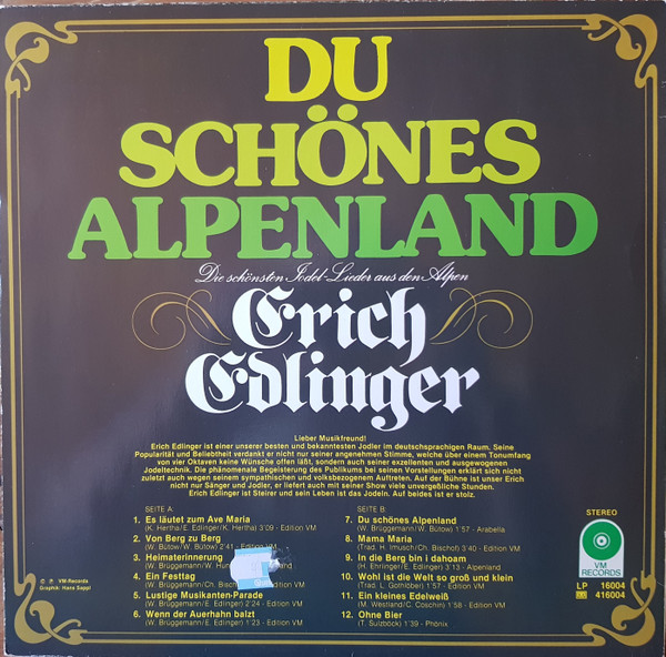 Vinyl / Erich Edlinger - Du Schönes Alpenland - Die Schönsten Jodel-Lieder Aus Den Alpen