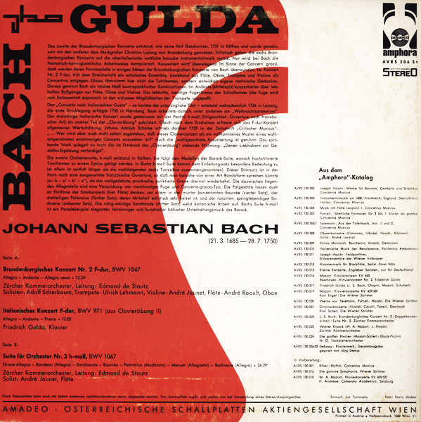 Friedrich Gulda, Johann Sebastian Bach, Zürcher Kammerorchester, Edmond De Stoutz - Brandenburgisches Konzert Nr. 2 F-dur / Italienisches Konzert F-dur / Suite Für Orchester Nr. 2 h-moll