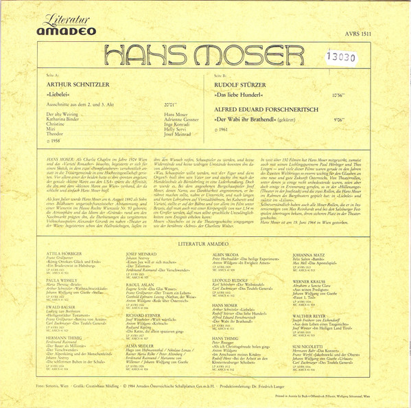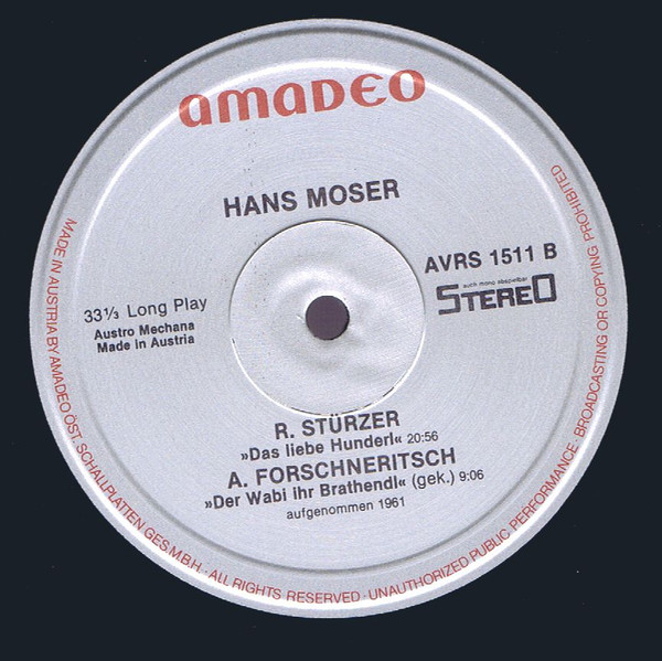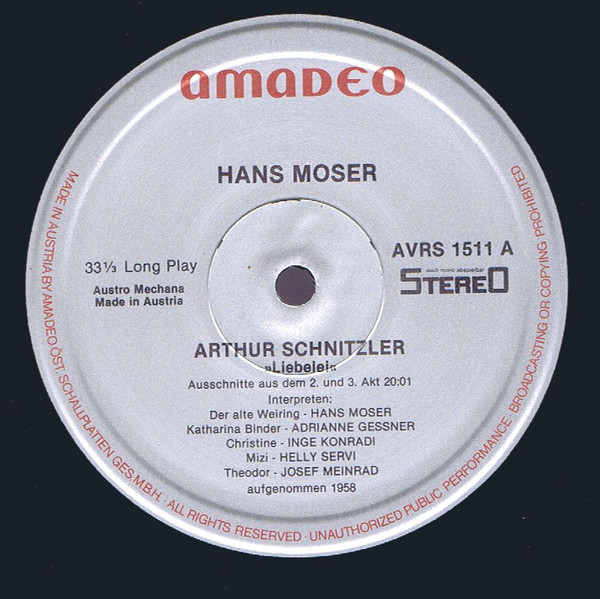 Hans Moser - Arthur Schnitzler - Liebelei, Rudolf Stürzer - Das Liebe Hunderl, Alfred Eduard Forschneritsch - Der Wabi Ihr BrathendlFormat: Vinyl, LPLabel: Amadeo - Cat#: AVRS 1511Released: Austria, 1984Genre/Style: Non-Music, Spoken WordMedia Condition: Near Mint (NM or M-)Sleeve Condition: Near Mint (NM or M-)Tracklist:A1. »Liebelei« Ausschnitte Aus Dem 2. Und 3. Akt (20:01)B1. »Das Liebe Hunderl« (10:56)B2. »Der Wabi Ihr Brathendl» (9:06)