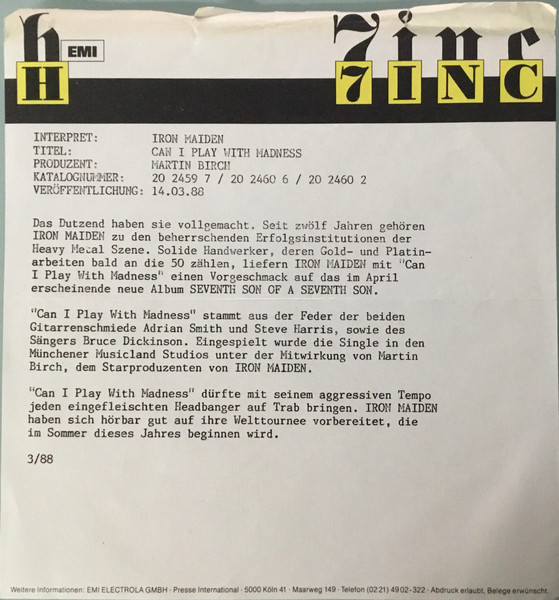 Vinyl / Iron Maiden - Can I Play With Madness
