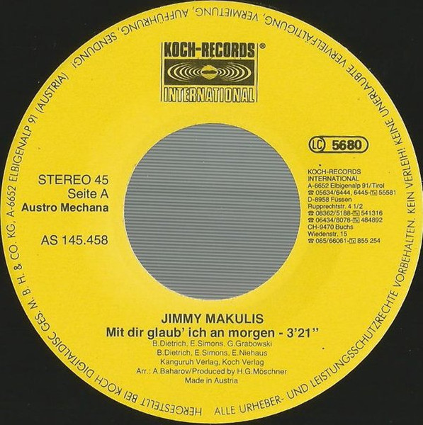 Jimmy Makulis - Mit Dir Glaub'n Ich An MorgenFormat: Vinyl, 7", Single, 45 RPMLabel: Koch Records International - Cat#: AS 145.458Released: AustriaGenre/Style: Pop, SchlagerMedia Condition: Near Mint (NM or M-)Sleeve Condition: Near Mint (NM or M-)Tracklist:A. Mit Dir Glaub' Ich An Morgen (3:21)B. Doch Mein Herz Bleibt Immer In Athen (4:04)