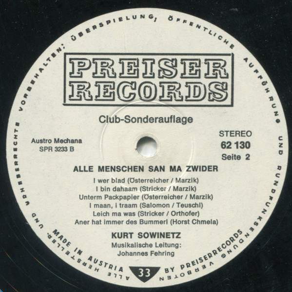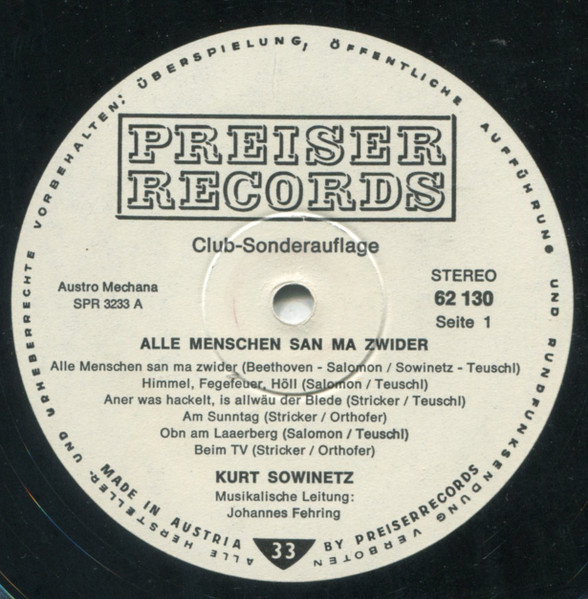 Vinyl / Kurt Sowinetz - Alle Menschen San Ma Zwider