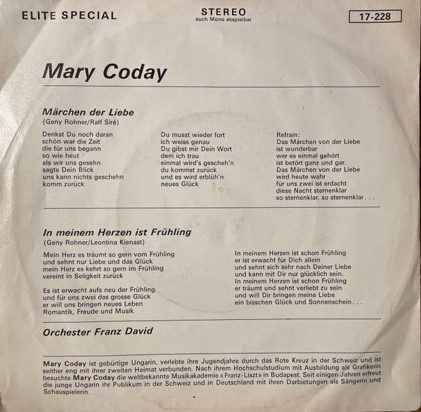 Vinyl / Mary Coday - Märchen Der Liebe / In Meinem Herzen Ist Frühling