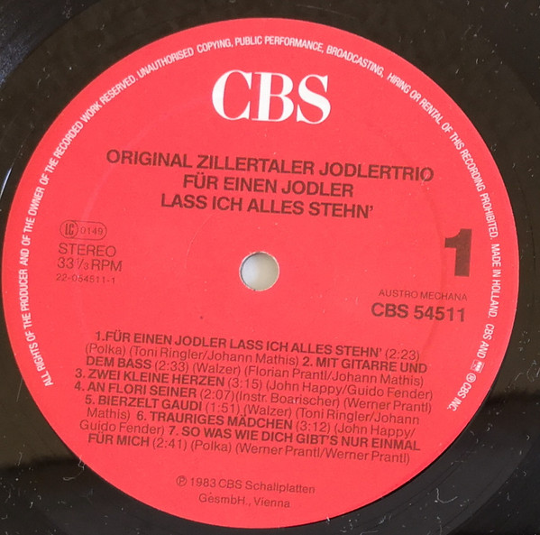 Vinyl / Orig. Zillertaler Jodlertrio* - Für Einen Jodler Lass Ich Alles Stehn'