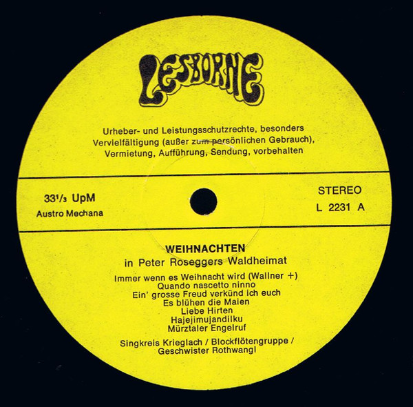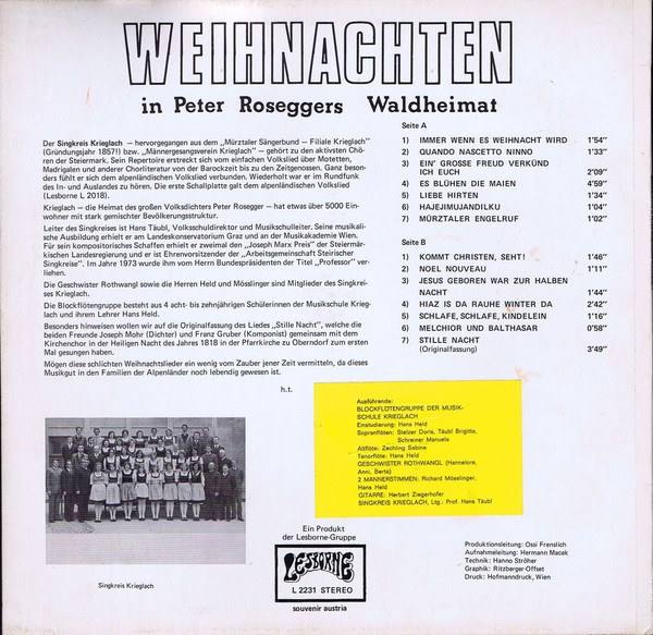 Vinyl / Singkreis Krieglach - Weihnachten In Peter Roseggers Waldheimat