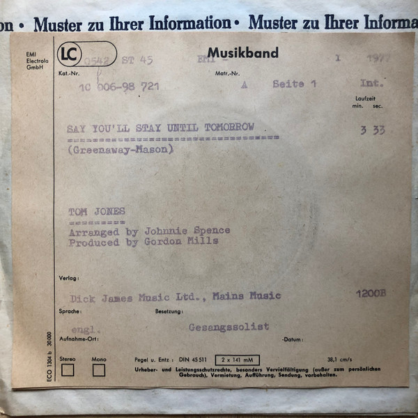 Vinyl / Tom Jones - Say You'll Stay Until Tomorrow