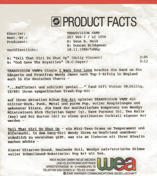 Vinyl / Transvision Vamp - Tell That Girl To Shut Up