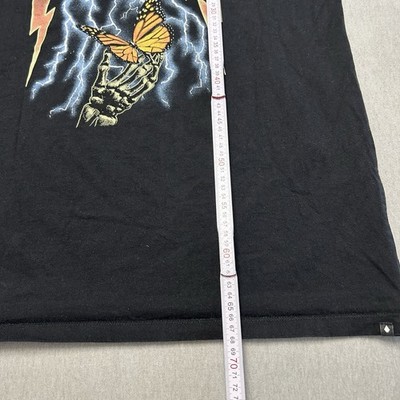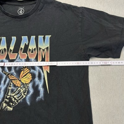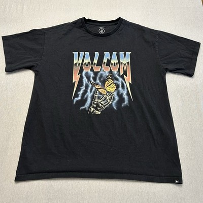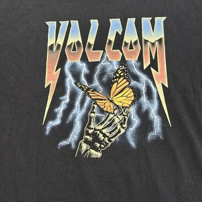 · Design: Markanter Frontprint mit einer Skeletthand, die einen Monarchfalter hält, umgeben von blauen Blitzen. Der Volcom-Schriftzug oben ist im klassischen Heavy-Metal-/Rock-Stil gestaltet.