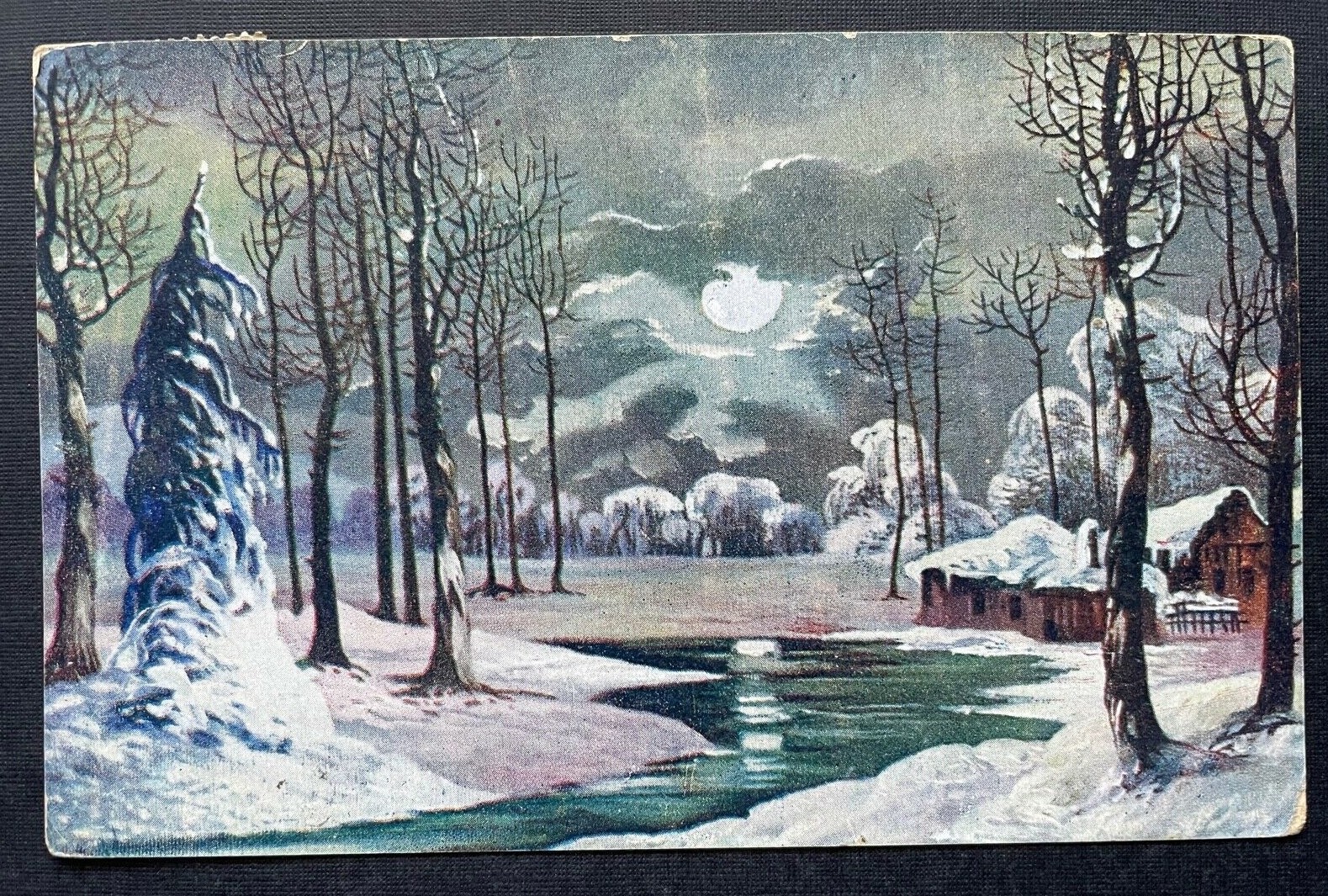 Winter Landschaft Schnee Fluss Eis Baum Haus Mond Nacht Malerei 400338 TH F